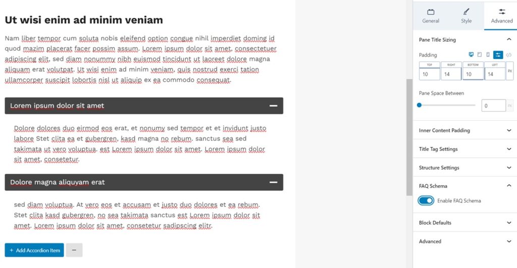 - If you want to have a FAQ with correct schema markup you can use the Accordion block from Kadence Blocks and enable FAQ Schema