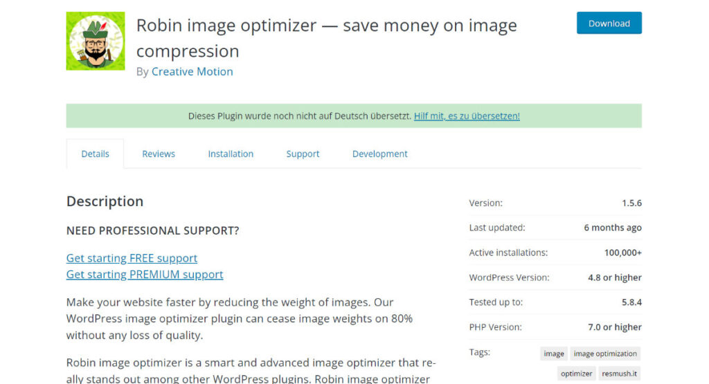 If you don’t want to spend money, I can recommend the free version of Robin Image Optimizer. This image optimization plugin allows you to compress an unlimited amount of image files up to a size of 5 MB and with various compression levels.