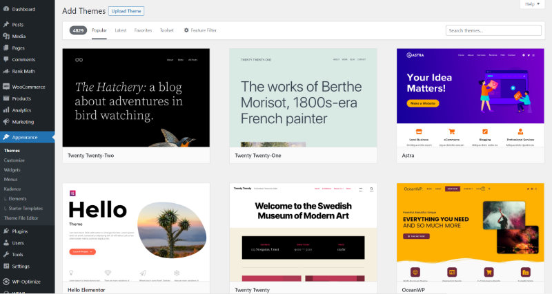 First you need the free version of the Kadence theme. To do this, go to Appearance > Themes in your WordPress dashboard and then click Add Theme in the upper left corner of the screen. In the search bar on the right, type Kadence.
