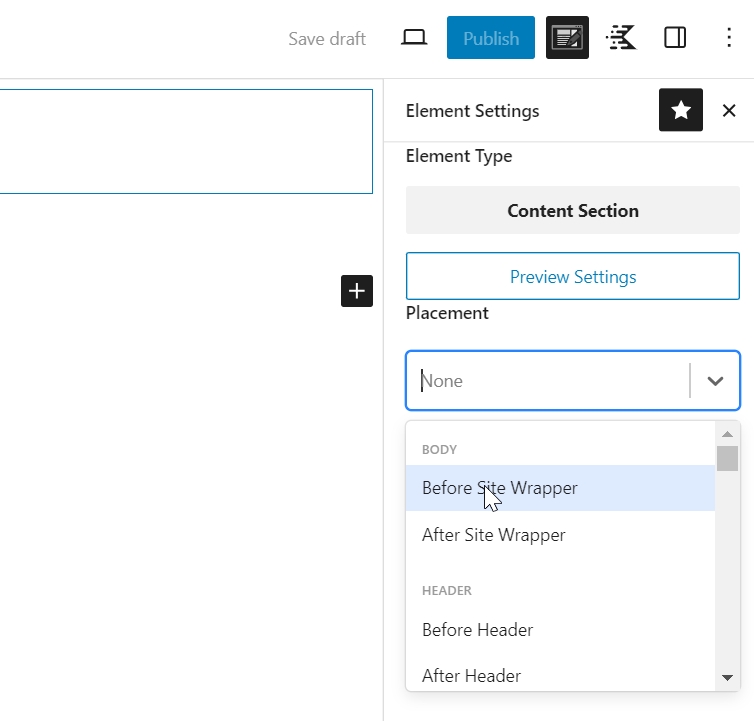 When configuring your Element, you can choose where it will appear on your site by selecting the appropriate placement option or using a custom hook.