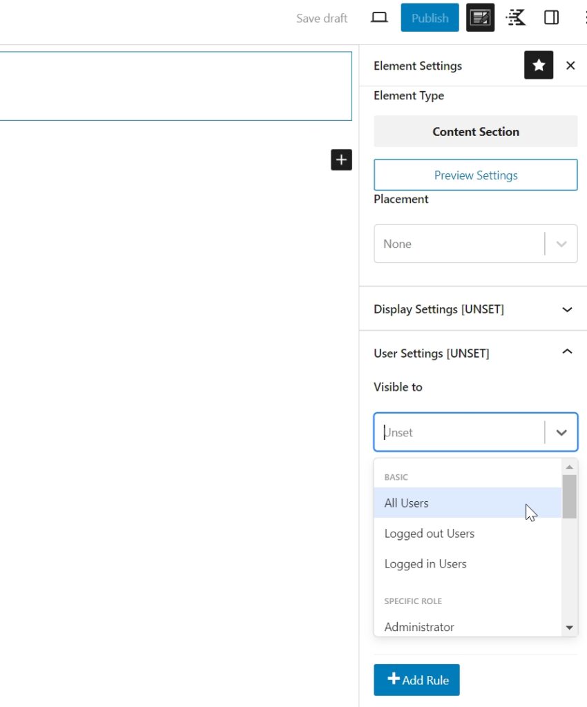 - Go to “User Settings”. If you want to make the element visible for all website visitors, just choose “All Users”. Display settings and user settings must be set for each element.